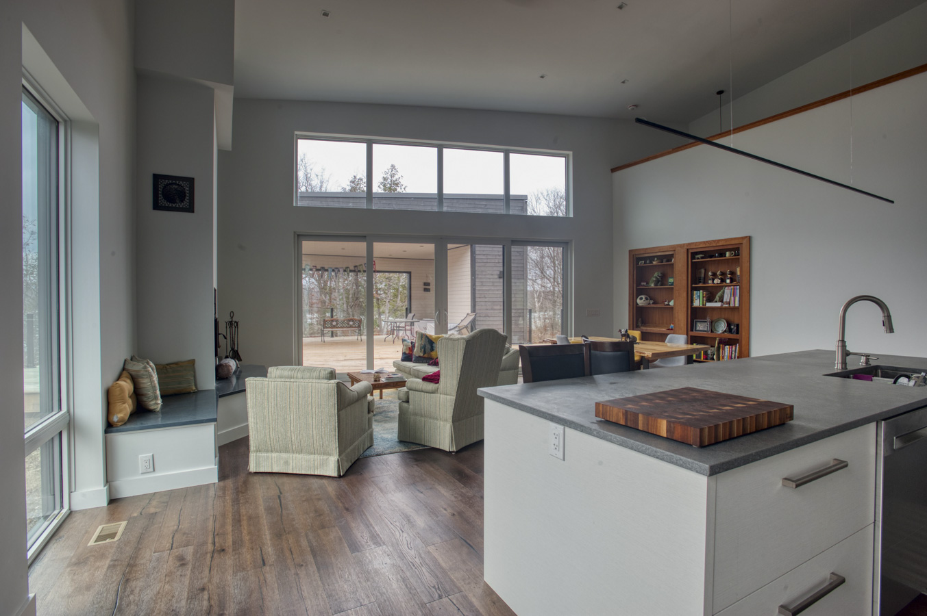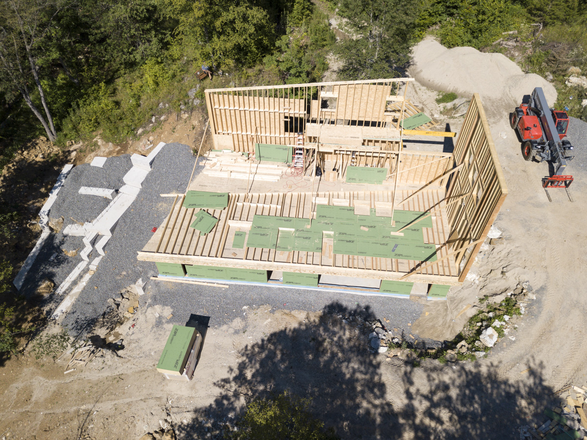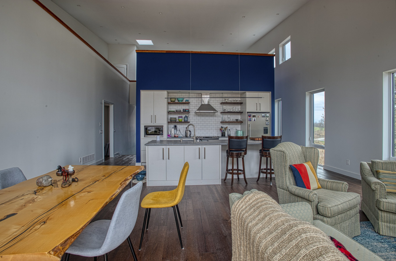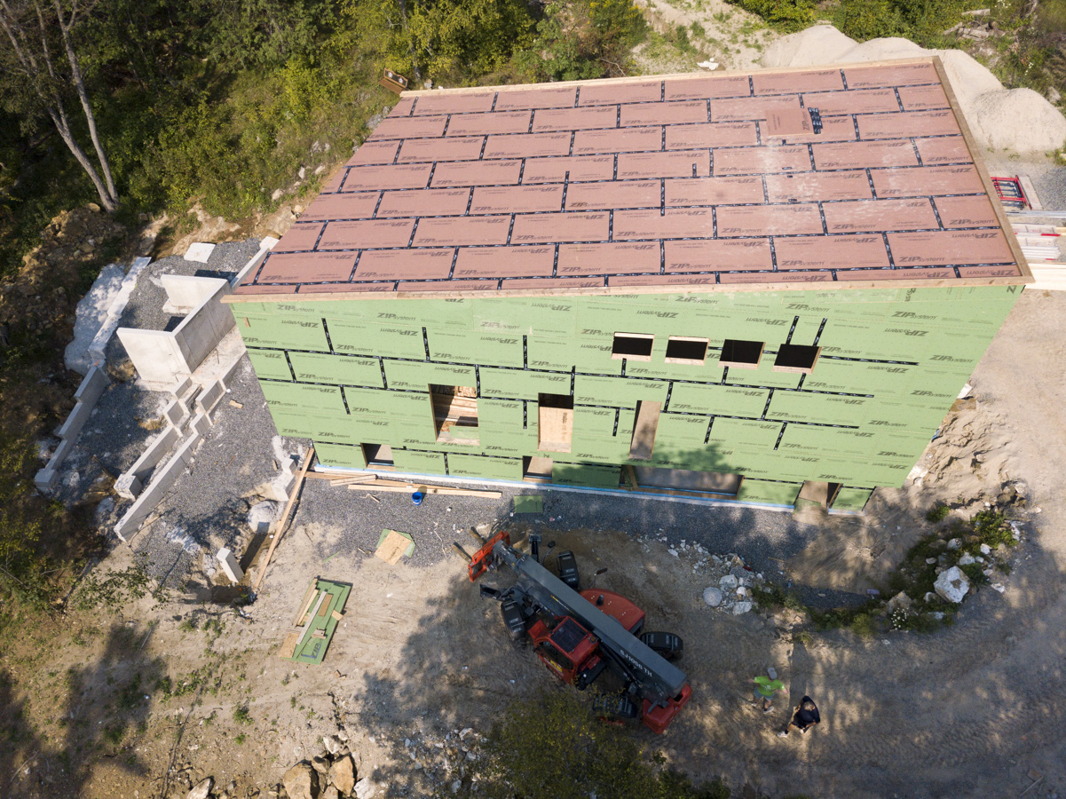 Efficiency: Airtight rating of 0.23 ACH@50kp, R40-rated walls, R70-rated roof, and triple-glazed windows and doors. Heat is provided by two water source heat pumps—one supplying hydronic heat for the basement slab; the other heating and cooling via an air handler.