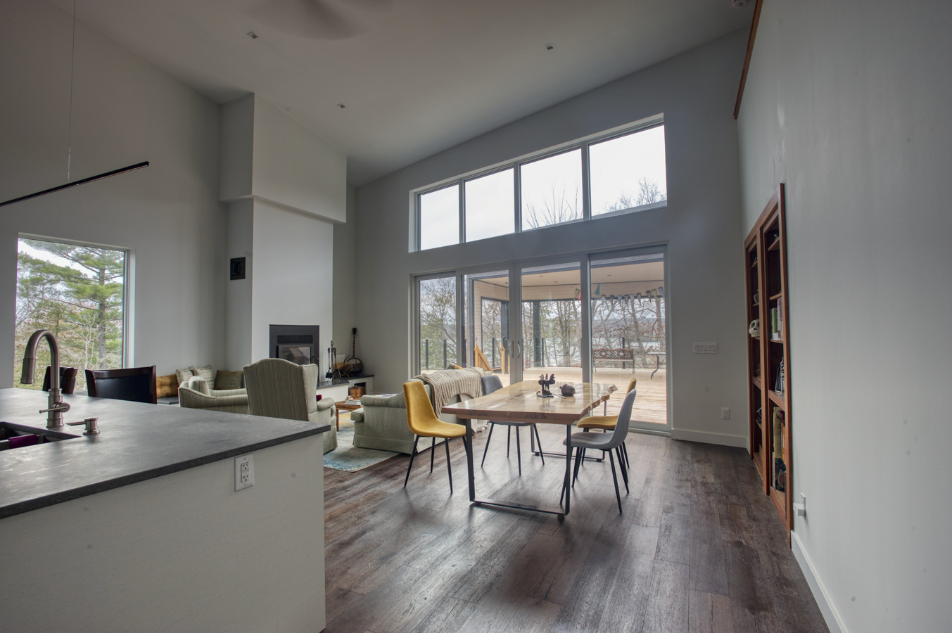 Features: 24-foot vaulted ceilings, bridge to a loft, a hidden staircase, invisible “Murphy door”, and a raised deck with a glassed-in exterior pavilion.