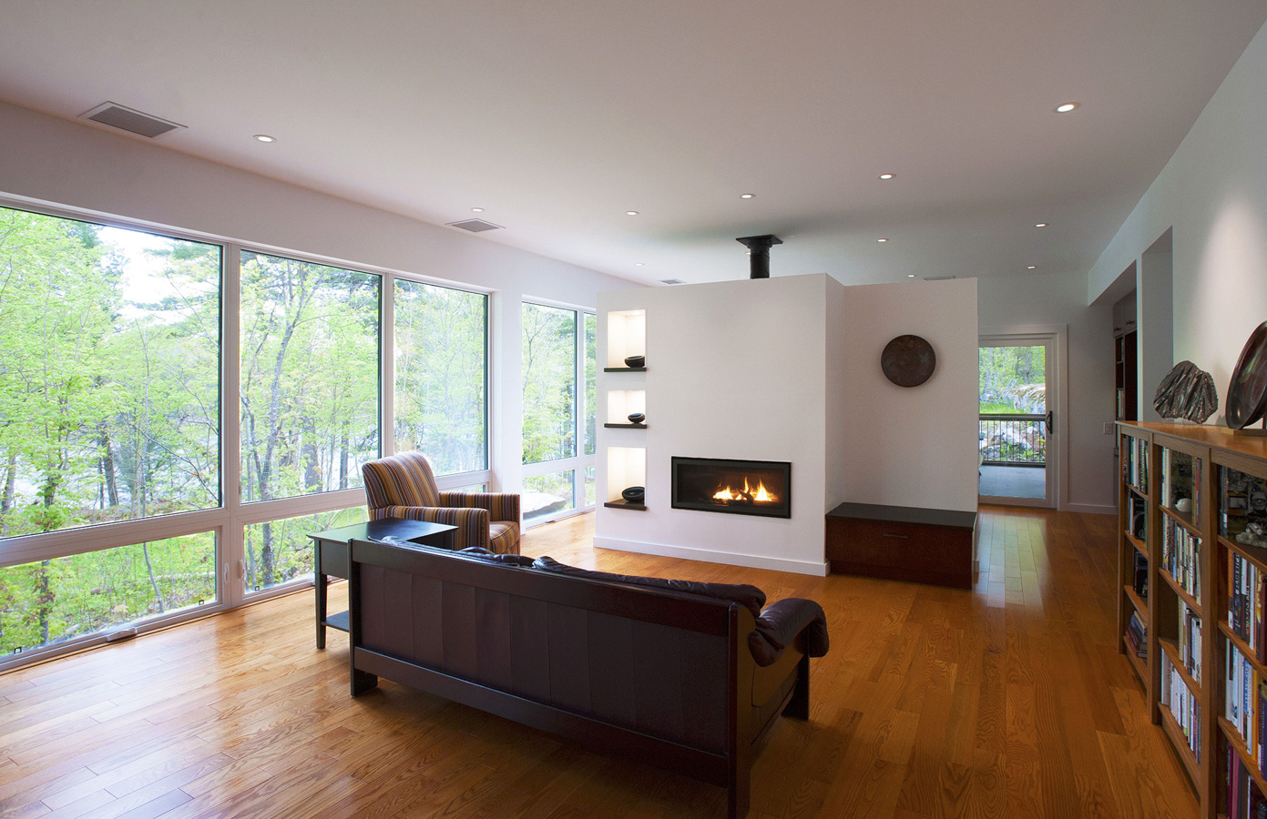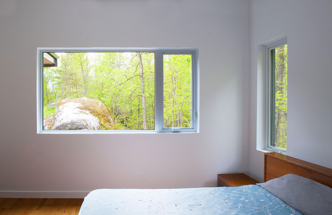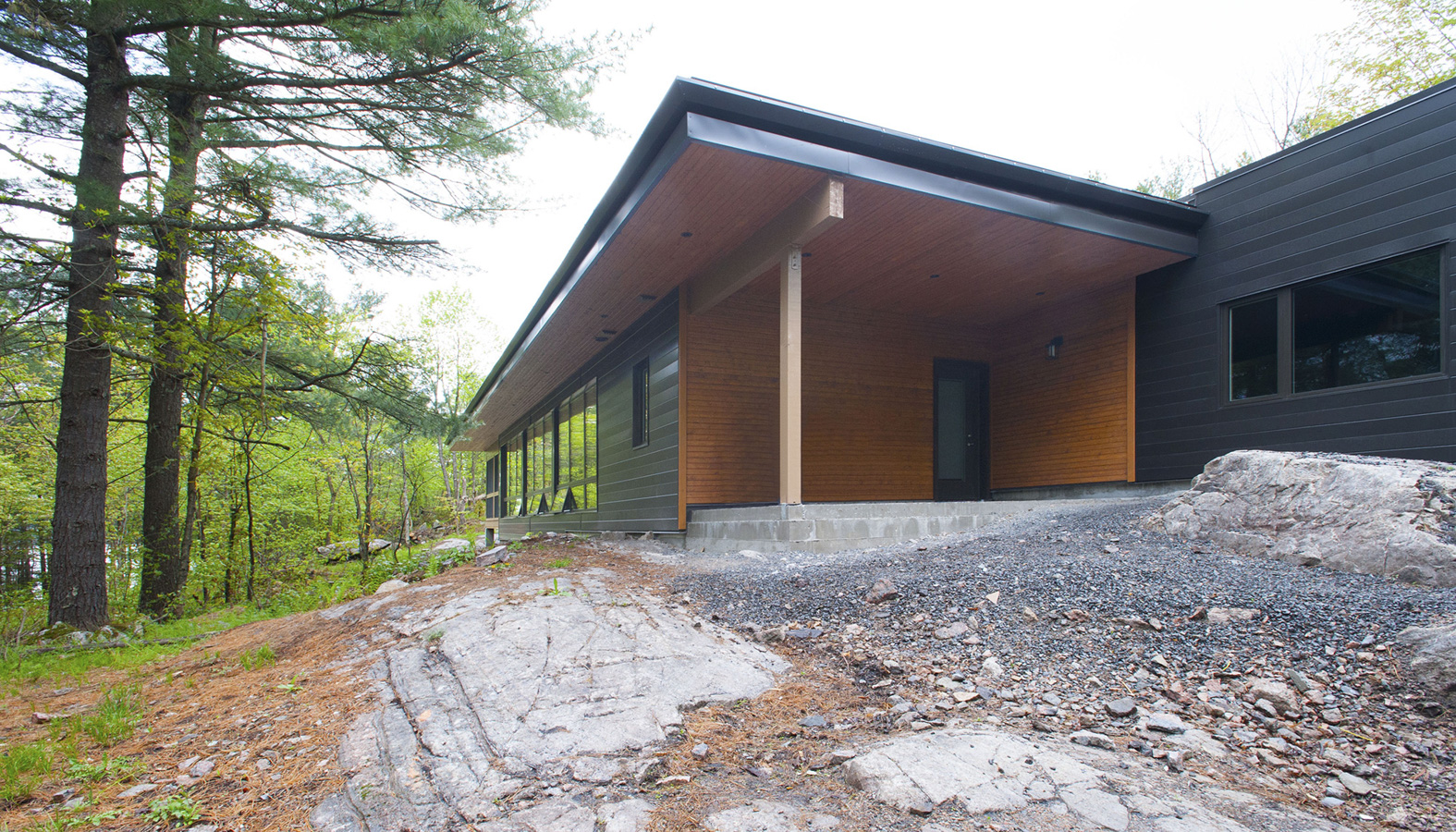 This low-profile compact home is nestled into an outcropping of Canadian Shield granite overlooking a lake in eastern Ontario. Its design incorporates aging in place principals and has no stairs or basement. Its building envelope includes triple glazed, airtight windows and doors, Zip System exterior sealed panels with breathable mineral wool exterior insulation. The insulation under its permanent wood floor and in its unvented roof system has been upgraded to ensure that it is as comfortable as it is beautiful. With airtightness tested at 0.59 ACH, it exceeds the Passive House standard.