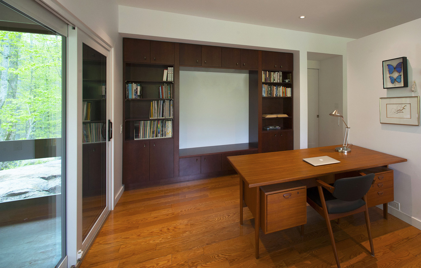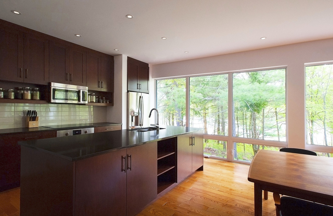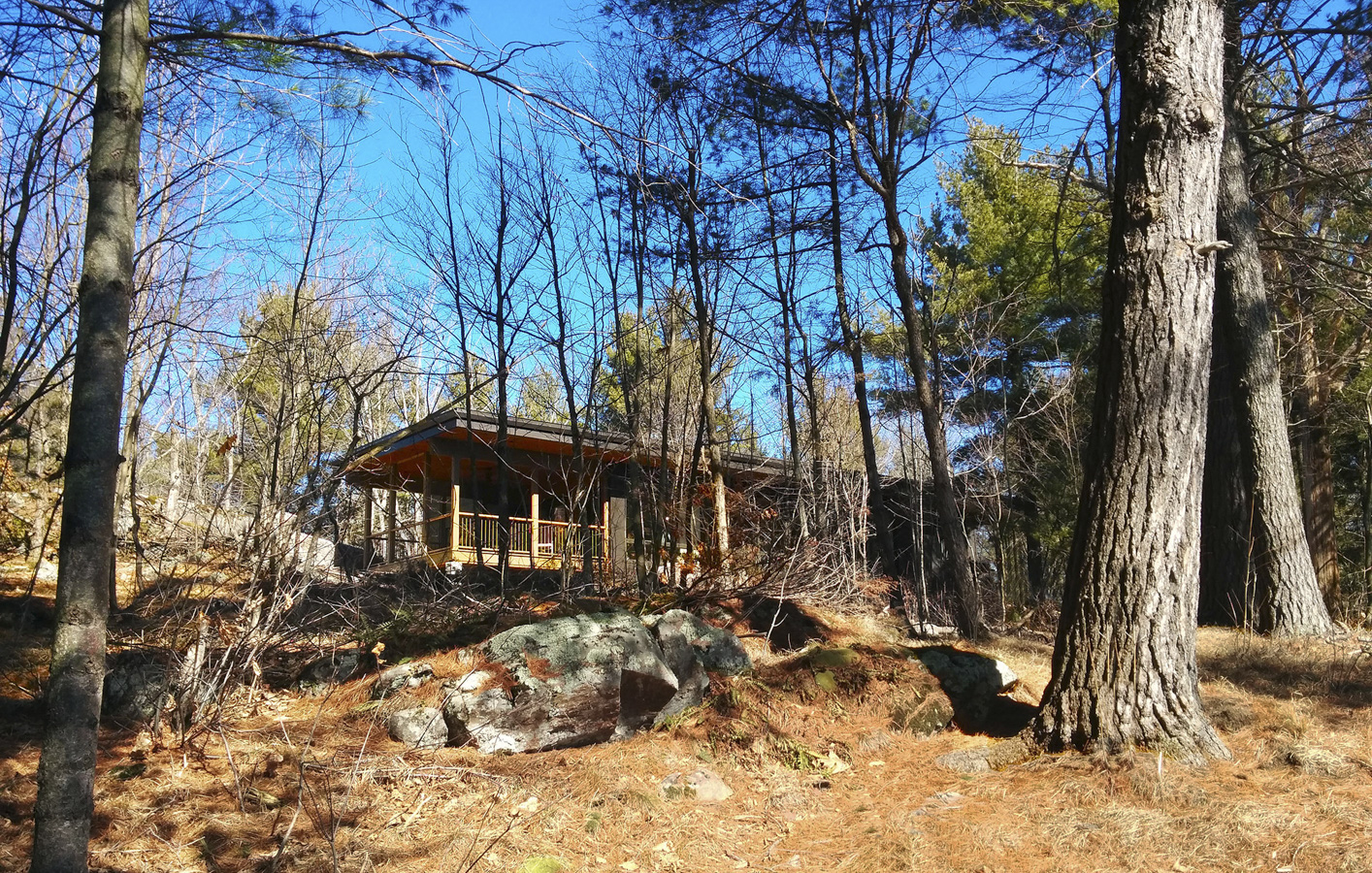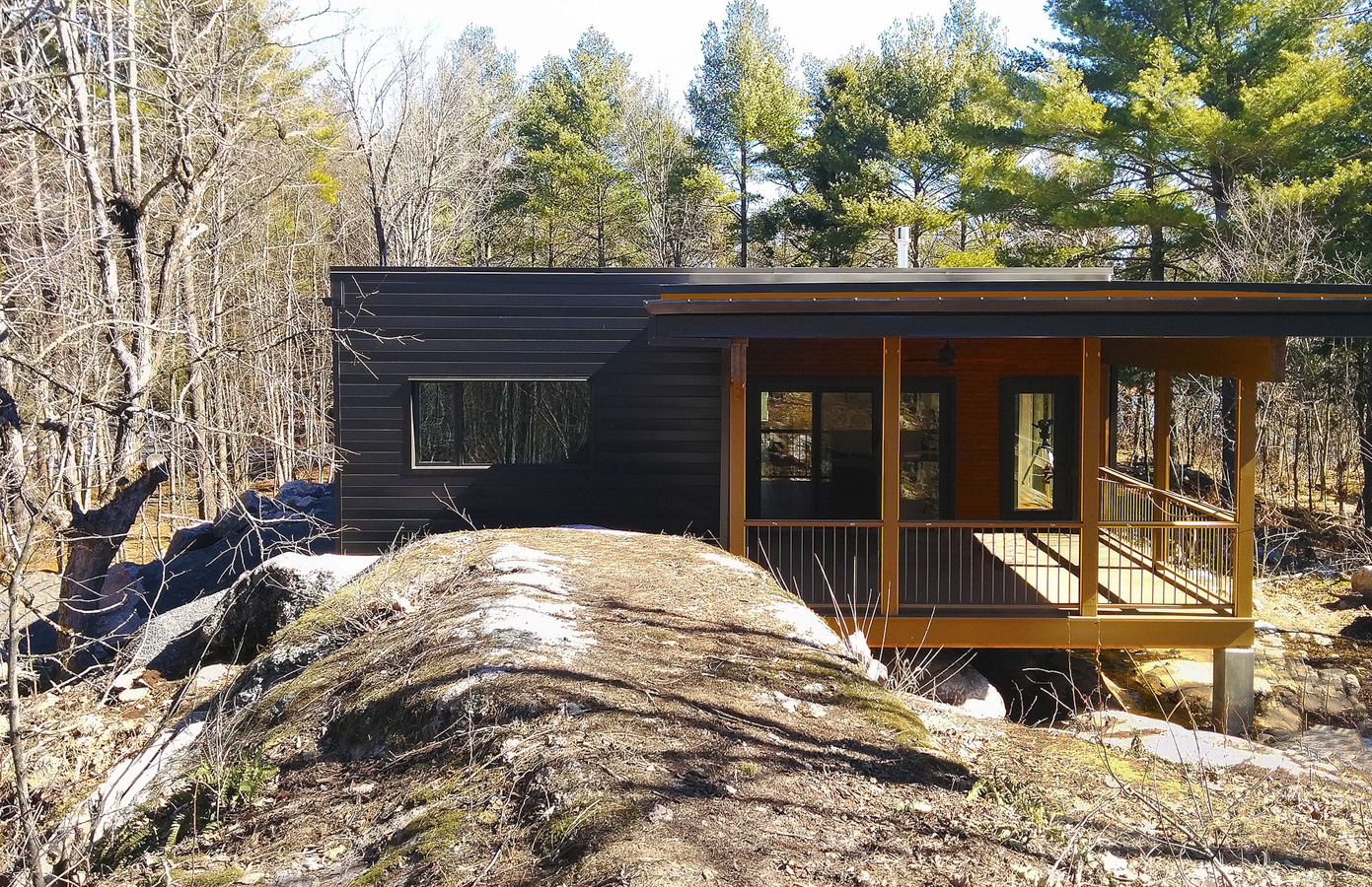 This low-profile compact home is nestled into an outcropping of Canadian Shield granite overlooking a lake in eastern Ontario. Its design incorporates aging in place principals and has no stairs or basement. Its building envelope includes triple glazed, airtight windows and doors, Zip System exterior sealed panels with breathable mineral wool exterior insulation. The insulation under its permanent wood floor and in its unvented roof system has been upgraded to ensure that it is as comfortable as it is beautiful. With airtightness tested at 0.59 ACH, it exceeds the Passive House standard.